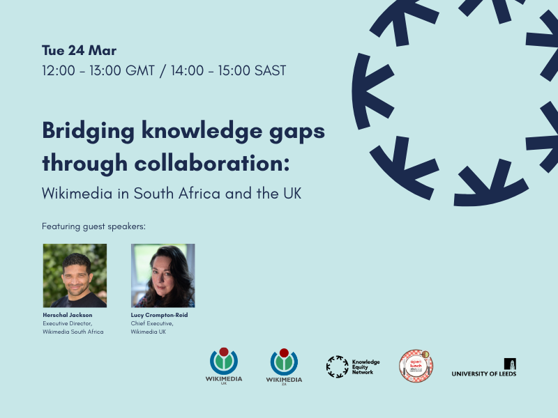 Mar 24 Bridging knowledge gaps through collaboration: Wikimedia in South Africa and the UK 12:00 pm - 1:00 pm GMT Leeds, United Kingdom Leeds, United Kingdom Event Details Get Directions