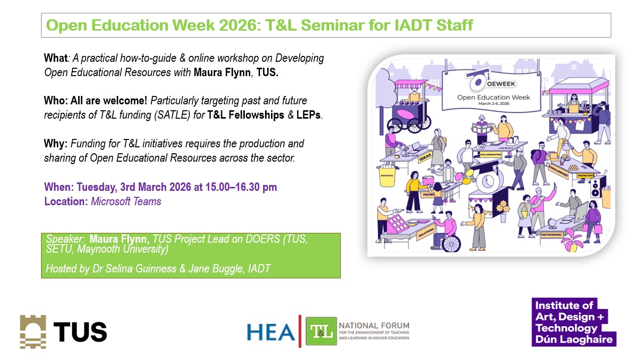 Open Education Week 2026: T&L Seminar for IADT Staff Mar 3 Open Education Week 2026: T&L Seminar for IADT Staff 3:00 pm - 4:30 pm GMT