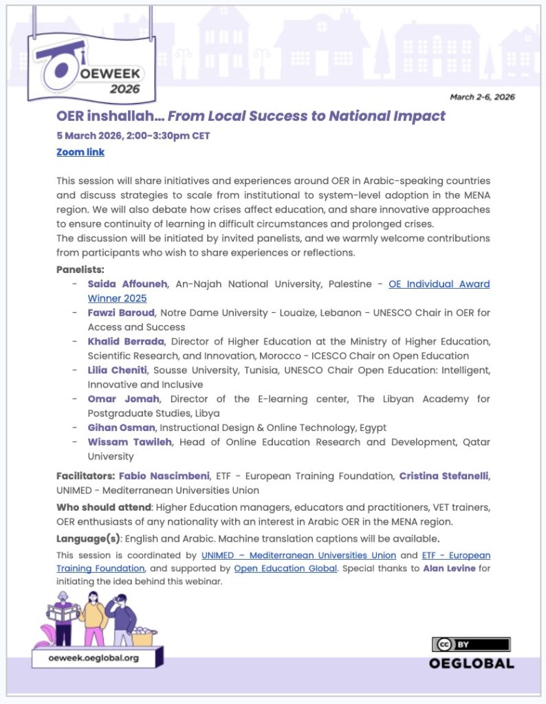 Who should attend: Higher Education managers, educators and practitioners, VET trainers, OER enthusiasts of any nationality with an interest in Arabic OER in the MENA region.