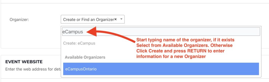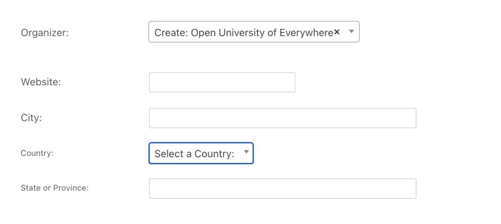 - Start typing the name of the organization hosting the event. If it already exists, click on the entry listed. If not, type the full name and click Create. This will reveal the fields to edit, including the web address for the organization as well its location in terms of city and country (plus state/province if relevant). This information is used to geolocate the place where the event originates on our global Open Education Event map.
