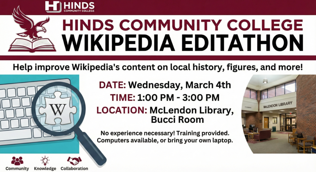 Hinds Community College’s Wikipedia Editathon is taking place Wednesday, March 4th from 1-3pm, McLendon Library in the Bucci Room.